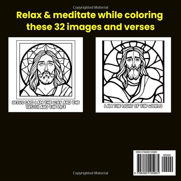 • 32 Unique Designs: Stunning stained-glass illustrations of Jesus, each paired with a meaningful Bible verse to color.